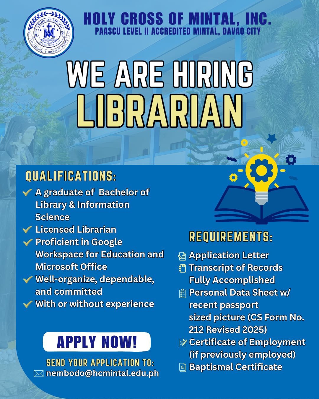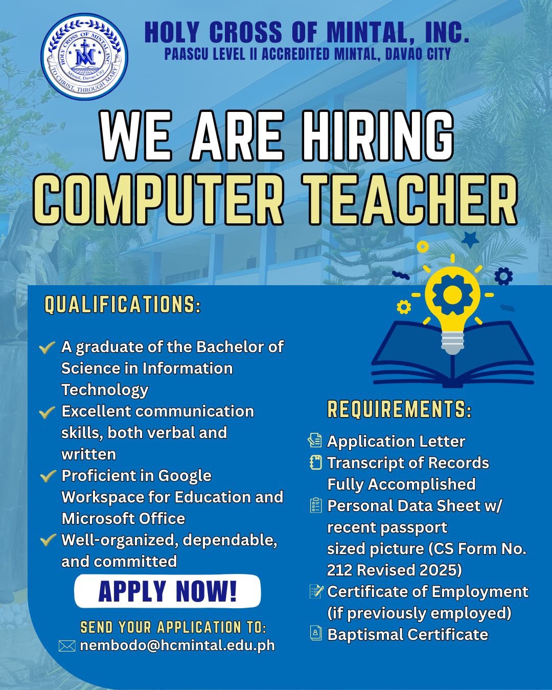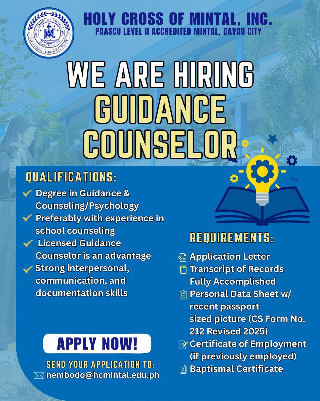 The Human Resource Department ensures that Holy Cross of Mintal is supported by competent, committed, and values-driven personnel. HR oversees recruitment, staffing, employee welfare, professional development, performance management, and adherence to school policies. The department is dedicated to fostering a positive working environment that upholds the school’s mission of providing quality, faith-centered education.