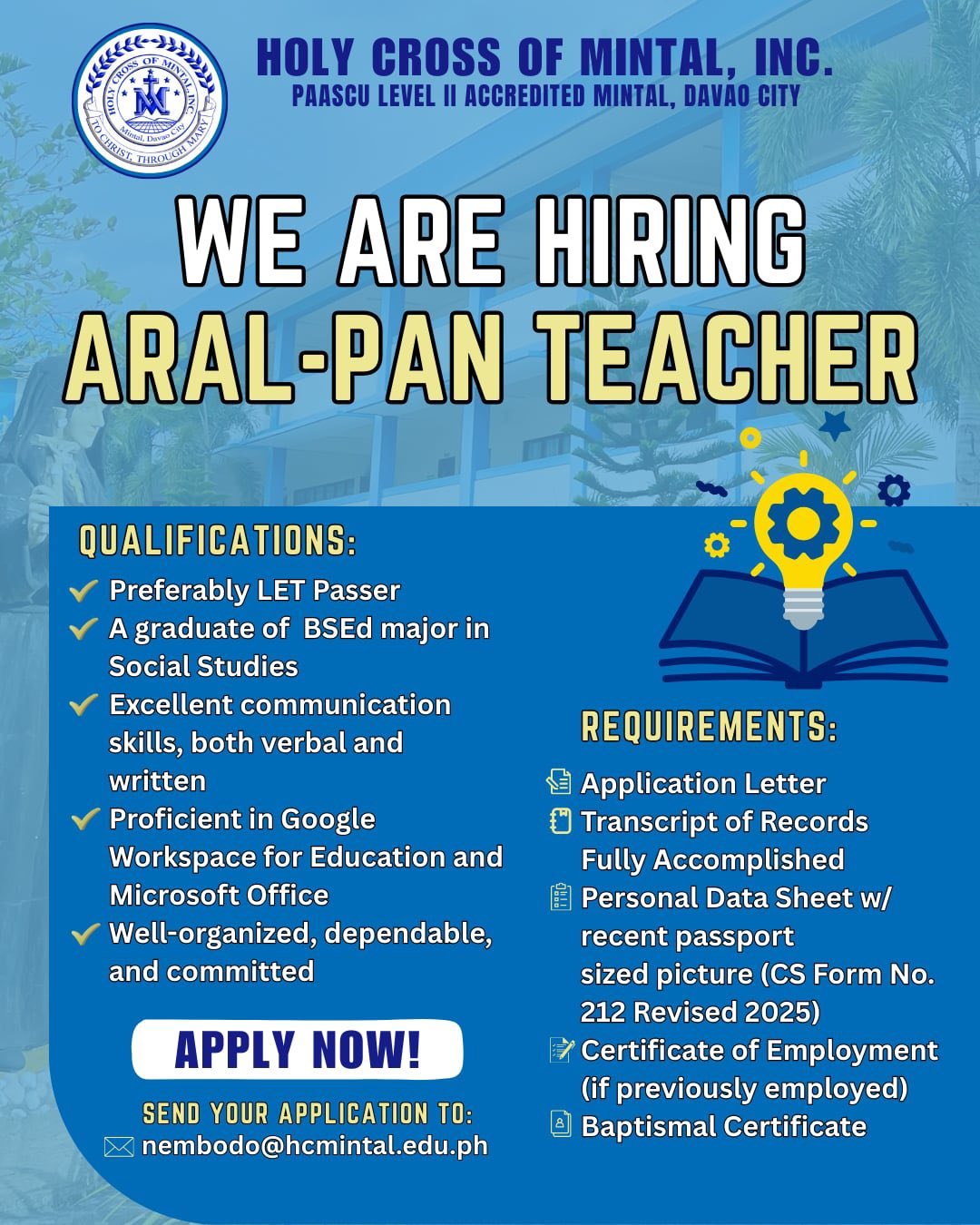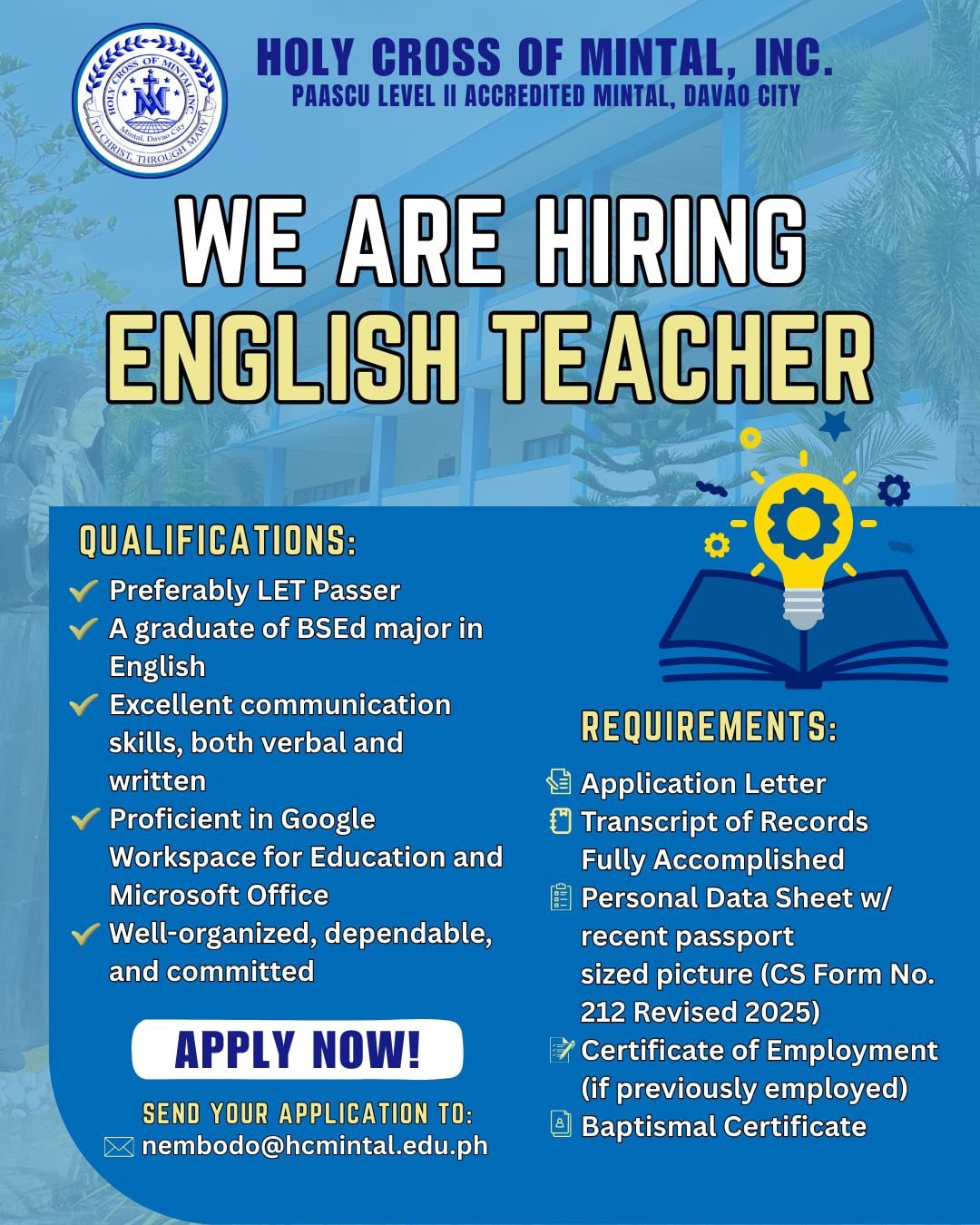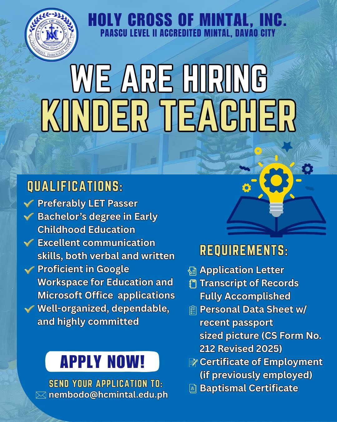 The Human Resource Department ensures that Holy Cross of Mintal is supported by competent, committed, and values-driven personnel. HR oversees recruitment, staffing, employee welfare, professional development, performance management, and adherence to school policies. The department is dedicated to fostering a positive working environment that upholds the school’s mission of providing quality, faith-centered education.